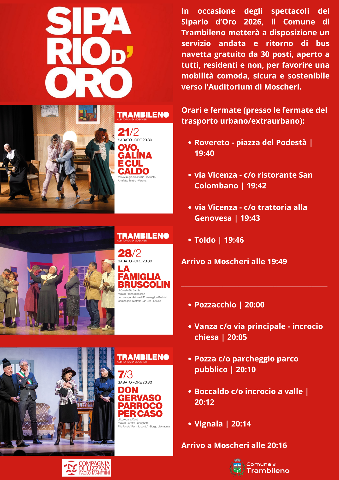 In occasione degli spettacoli del Sipario d'Oro 2026, l'Amministrazione comunale metterà a disposizione un servizio gratuito di bus navetta andata e ritorno da 30 posti; aperto a tutti, residenti e non, per favorire una mobilità comoda, sicura e sostenibile verso l’Auditorium di Moscheri.Il servizio seguirà le fermate del trasporto urbano ed extraurbano con le seguenti tappe:
